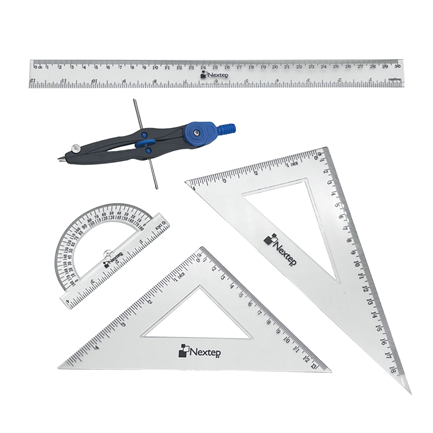 Piezas: 1 regla 30cm, 1 escuadra 13.5cm/45¡, 1 escuadra 18.5cm/60¡, 1 transportador 180¡ y 1 compás de precisión