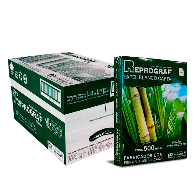 Papel Reprograf A4 Papeles para imprenta, escritura y oficina fabricado a partir de la fibra de caña de azúcar está catalogado internacionalmente como "Amigo de la Naturaleza". Mediante el proceso de elaboración de papel con esta fibra se reducen los desechos sólidos y se produce un papel fino, biodegradable y reciclable Presentaciones (resma, carta, A4, oficio).